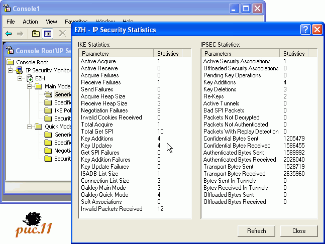 и если пошли строчки Negotiating IP Security, то значит, системы выбирают общие типы шифрования. Если строки Negotiating IP Security не прекращаются, то вы что-то не так сделали. Обратите внимание на параметр pfs - на компьютерах, устанавливающих связь, он должен иметь одинаковые значения и т.д. - смотрите логи, разбирайтесь. Если же все заработало, то компьютеры видят друг друга идеально. Вы можете убедиться, что IPSEC действительно заработал, используя оснастку IP Security Monitor в WinXP, как это показано на рис.11. или утилиту ipsecmon.exe в win2k, или что-либо еще на ваш выбор (например, Network Monitor).