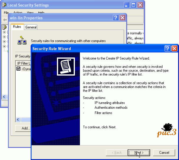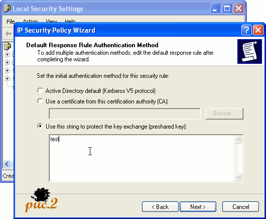 Затем выбираем меню Create IP Security Policy. На вкладке IP Security Policy Name задайте любое понятное вам название - например "win-lin". Оставляем пункт Activate the default response rule выбранным. На вкладке Default Response Rule Authentication Method выбираем опцию Use this string to protect the key exchange (preshared key) и задаем наш <key>, как это показано на рис.2 и создаем политику.