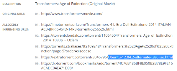 Вообще не редкость, когда раздачи чего-нить эдакого маскируют под что-то безобидное. Наверняка, сперва реально была раздача трансфермеров, маскирующаяся под убунту, на каком-нить анонимном трекере с реальной аннотацией в другом месте. А у правообладателя шерудит скрипт, который сперва нашёл реальную аннотацию, по ней раздачу, а потом автоматика же попросила гугол забанить все похожие раздачи.