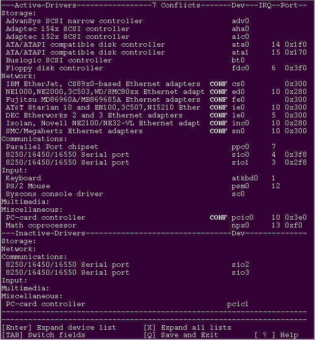 Драйвера включенные в GENERIC ядро зачастую используют одинаковые Прерывания/Порты (IRQ/Port) и это будет отображено как "Conflicts" - Конфликты. Утилита UserConfig используется для запрета-отключения зондирования отсутствующего оборудования и устранения конфликтов.