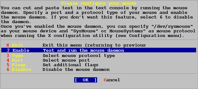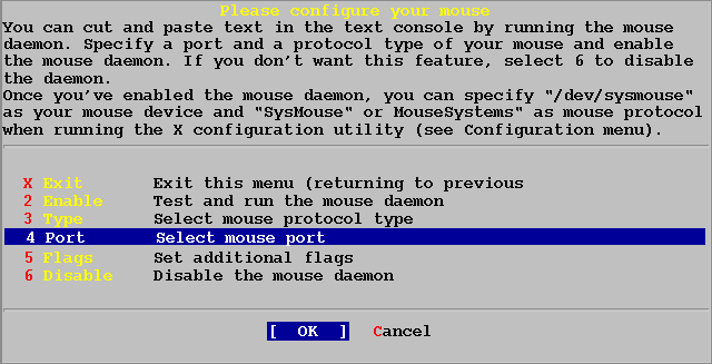 Использование 3'х кнопочной мыши позволит вам выделить часть текста экрана или программы, поместить его в буфер, чтобы затем извлечь данный текст из буфера в другом экране или программе. Если у вас 2'х кнопочная мышь, после установки внимательно прочитайте руководство (moused(8)) про режим эмуляции 3'х кнопочной мыши. В данном примере рассматривается non-USB мышь.