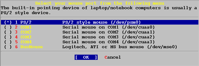 В этой системе используется мышь PS/2 и был выбран протокол "PS/2". Для смены порта используйте клавиши стрелок и затем нажмите spacebar - пробел. Выбирите [OK] и нажмите ENTER для выхода из этого меню.