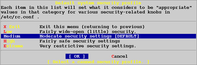 Если вы не знаете какой выбрать уровень безопасности, выбирите medium [по умолчанию]. Выбирите [OK] и нажмите ENTER.