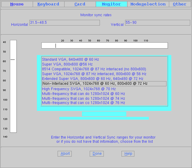 Не превышайте значения параметров чем возможности вашего монитора, вы можете его испортить. Если у вас есть сомнения, выбирите "ABORT" и найдите информацию по параметрам монитора. Остальная часть процесса установки не будет затронута и настройку X-Сервера вы сможете продолжить в любое время позже используя программу /stand/sysinstall.