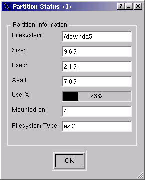 To see information about a partition (such as filesystem name, space used, and space available), right-click on the partition's histogram and then left-click on . A Partition Status window opens that displays information about the selected partition.