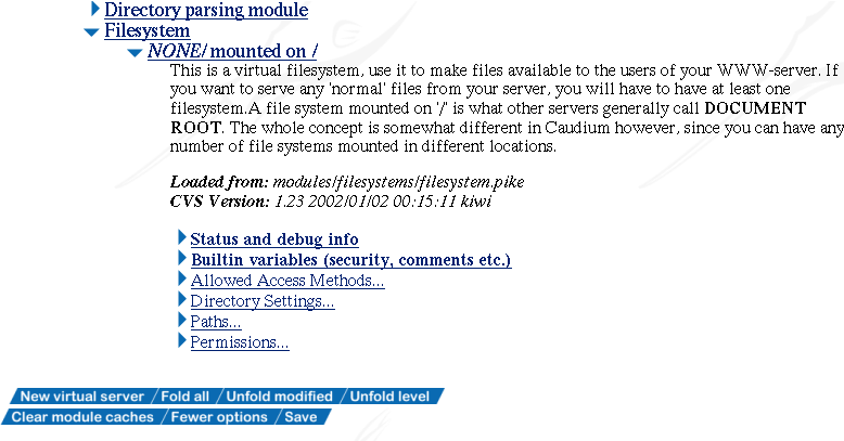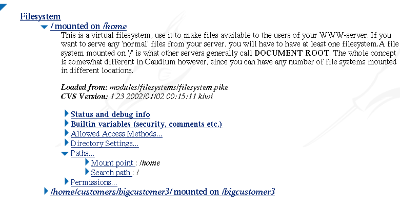 By selecting a file system, you tell Caudium which files it will send to people browsing your site. For those who know other web servers, please pay close attention to these explanations, because Caudium is quite different from other servers in this respect.