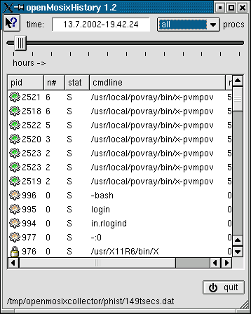 openMosixhistory gives a detailed overview which process was running on which node. The openMosixcollector saves the processlist from the host the collector was started on and you can browse this log-data with openMosixhistory. You can easy change the browsing time in openMosixhistory by the time-slider.