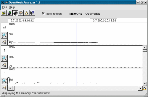 With the openMosixanalyzer you can have a non-stop openMosix-history of your cluster. The history log-files created by openMosixcollector are displayed in a graphically way so that you have a long-time overview what happened and happens on your cluster. The openMosixanalyzer can analyze the current "online" logfiles but you can also open older backups of your openMosixcollector history logs by the filemenu. The logfiles are placed in /tmp/openmosixcollector/* (the backups in /tmp/openmosixcollector[date]/*) and you have to open only the main history file "cluster" to take a look at older load-informations. (the [date] in the backup directories for the log-files is the date the history is saved) The start time is displayed on the top and you have a full-day view in the openMosixanalyzer (12 h).