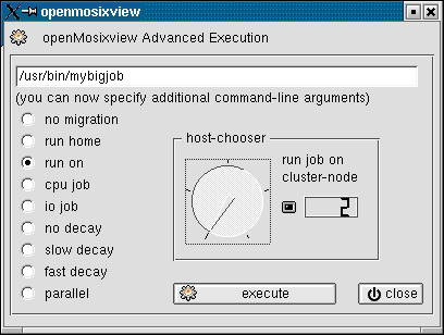 For all jobs you start non-local simple choose a host with the dial-widget. The openMosix-id of the node is also displayed by a lcd-number. Then click execute to start the job.