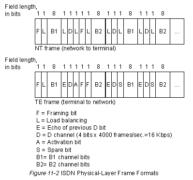 Форматы блока данных физическoго уровня (Уровень 1) ISDN различаются в зависимости от того, является блок данных отправляемым за пределы терминала (из терминала в сеть) или входящим в пределы терминала (из сети в терминал). Оба вида блока данных физического уровня показаны на Рис. 11-2 "Форматы блоков данных физического уровня ISDN". Длина блоков данных равна 48 битам, из которых 36 бит представляют информацию. Биты "F" обеспечивают синхронизацию. Биты "L" регулируют среднее значение бита. Биты "Е" используются для решения конфликтной ситуации, когда несколько терминалов на какой- нибудь пассивной шине претендуют на один канал. Бит "А"" активирует усройства. Биты "S" ещe не получили назначения. Биты "В1", "В2" и "D" предназначены для данных пользователя.