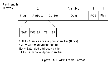 Уровнем 2 протокола обмена сигналами ISDN является Link Access Procedure, D channel (Процедура доступа к каналу связи, D-канал), известная также как LAРD. LAPD аналогична "Управлению каналом передачи данных высокого уровня" (HDLC) и "Процедуре доступа к каналу связи, сбалансированной" (LAPB) (смотри Главу 12 "SDLC и его производные" и Главу 13 "Х.25", где дается более подробная информация об этих протоколах). Как видно из раскрытия его акронима, LAPD используется в D-канале для того, чтобы обеспечить поток и соответствующий прием управляющей и сигнализирующей информации. Формат блока данных LAPD (смотри Рис. 11-3) очень похож на формат HDLC; также, как НDLC, LAPD использует блок данных супервизора, информационный и и непронумерованный блоки данных. Протокол LAPD формально определен в CCITT Q.920 и SSITT Q.921.