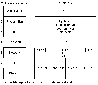Apple Talk относительно хорошо согласуется с эталонной моделью OSI. На Рис. 16-1 "Apple Talk и эталонная модель OSI" представлены протоколы Apple Talk, смежные с теми уровнями OSI, с которыми у них установлено соответствие. Этот рисунок отличается от других изображений связи пакета протоколов Apple Talk с моделью OSI тем, что на нем NBP, ZIP и RTMP размещены на Уровне 3, а АЕР-на Уровне 7. По мнению Cisco, NBP, ZIP и RТМP по своим функциональным возможностям стоят в ряду ближе к Уровню 3 модели OSI, хотя они и пользуются услугами DDP, другого протокола Уровня 3. Аналогично, Cisco полагает, что АРЕ следует включить в перечень протоколов прикладного уровня, т.к. он обычно используется для обеспечения функциональных возможностей прикладного уровня. В частности, АЕР помогает определить возможность отдаленных узлов принимать следующие соединения.