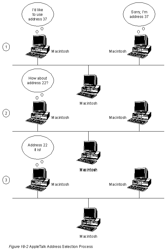 Для обеспечения минимальных затрат, связанных с работой администратора сети, aдреса узлов AppleTalk назначаются динамично. Когда Macintosh, прогоняющий AppleTalk, начинает работать, он выбирает какой-нибудь адрес протокола (сетевого уровня) и проверяет его, чтобы убедиться, что этот адрес используется в данный момент. Если это не так, то этот новый узел успешно присваивает себе какой-нибудь адрес. Если этот адрес используется в данный момент, то узел с конфликтным адресом отправляет сообщение, указывающее на наличие проблемы, а новый узел выбирает другой адрес и повторяет этот процесс. На Рис. 16-2 представлен процесс выбора адреса AppleTalk.