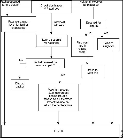 Когда какое-нибудь служебное устройство VINES принимает пакет, оно проверяет его, чтобы узнать, для чего он предназначается - для другого служебного устройства или для широкого вещания. Если пунктом назначения является данное служебное устройство, то это служебное устройство соответствующим образом обрабатывает этот запрос. Если пунктом назначения является другое служебное устройство, то данное служебное устройство либо непосредственно продвигает этот пакет (если это служебное устройство является его соседом), либо направляет его в служебное устройство/роутер, которые являются следующими в очереди. Если данный пакет является широковещательным, то данное служебное устройство проверяет его, чтобы узнать, пришел ли этот пакет с маршрута с наименьшими затратами. Если это не так, то пакет отвергается. Если же это так, то пакет продвигается на всех интерфейсах, за исключением того, на котором этот пакет был принят. Такой метод помогает уменьшить число широковещательных возмущений, которые являются обычной проблемой в других сетевых окружениях. Aлгоритм маршрутизации VINES представлен на Рис. 21-4.