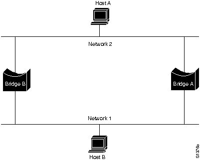 Предположим, что Хост А отправляет блок данных в Хост В. Оба моста принимают этот блок данных и и делают правильный вывод о том, что машина А находится в сети 2. К сожалению, после того, как машина В примет два экземпляра блока данных машины А, оба моста снова получают этот же блок данных на свои интерфейсы с Сетью 1, т.к. все хосты принимают все сообщения широковещательных LAN. В некоторых случаях мосты затем изменяют свои внутренние таблицы, чтобы указать, что машина А находится в Сети 1. В этом случае при ответе машины В на блок данных машины А оба моста примут, а затем проигнорируют эти ответы, т.к. их таблицы укажут, что данный пункт назначения (машина А) находится в том же сегменте сети, что и источник этого блока данных.