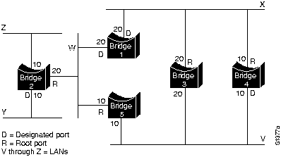 В некоторых случаях два или более мостов могут иметь одинаковые затраты корневого тракта. Например, на Рис. 29-3 как Мост 4, так и Мост 5 могут достичь Мост 1 (корневой мост) с затратами тракта 10. В этом случае снова используются идентификаторы моста, на этот раз для определения назначеных мостов. При выборе предпочтение отдано порту LAN V Моста 4 перед портом LAN V Моста 5.