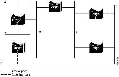 При использовании этого процесса устраняются все мосты, непосредственно соединенные с каждой LAN, кроме одного; таким образом, удаляются все петли между двумя LAN. STA также устраняет петли, включающие более двух LAN, в то же время сохраняя связность. На Рис. 29-4 "Сеть ТВ после прогона STA" показаны результаты действия STA в сети, изображенной на Рис. 29-3. На Рис. 29-4 более четко показана топология дерева. Сравнение этого рисунка с рисунком сети до прогона STA показывает, что STA перевел в режим резерва как порты Моста 3 в LAN V, так и порты Moста 5 в LAN V.