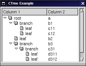 The CTree widget is derived from the CList widget. It is designed to display hierarchically-organised data. The tree is displayed vertically, and branches of the tree can be clapsed and expanded as required by the user.