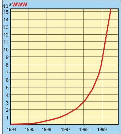 Рис. 1. Число выпущенных документов RFC по годам. К 1979 году полностью сформировался пакет протоколов TCP/IP и их приложений, началось внедрение. К 1989 году выявились некоторые недостатки старых протоколов, возникла необходимость разработки новых. Рост числа публикаций в период 1989-99 в основном определяется разработками в области безопасности (TLS (RFC-2246, -2817), RADIUS (RFC-2058), а также RFC-2817, -2845, -2875 и многие др.), мультимедиа (MIME; RFC-1590, -2045, -2046, -2047, -2048, -2049) и специальных приложений (например, протокол IOTP). Рост числа узлов Интернет за этот же интервал времени (рис. 2) и количества WEB-серверов (рис. 3) также впечатляет.