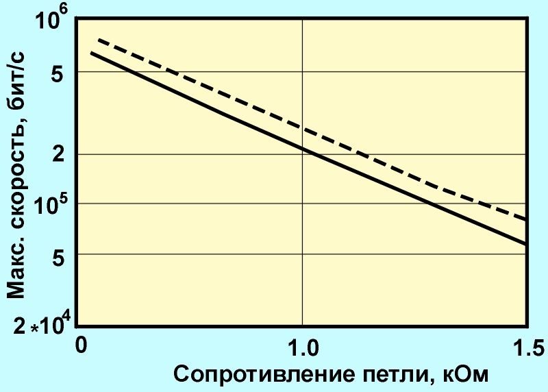 На рис. 2.1.7 показана зависимость скорости пропускания от сопротивления петли передающей линии для разных схем кодирования сигнала (пунктирной линией отображен вариант четырехуровневого кодирования). Те, кто работал с выделенными линиями, усвоили эту зависимость на практике. Если сопротивление линии более 1,5 кОм вы скоро будете знать дежурных вашей телефонной станции по имени, узнаете, что такое грозовые вставки и что они имеют привычку окисляться.