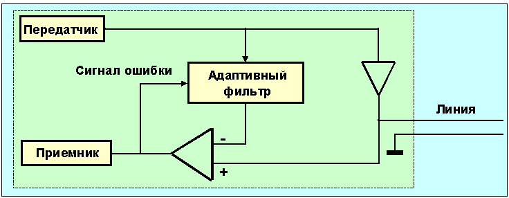 Более широко для реализации двухстороннего обмена по одной паре проводов используется метод эхо-компенсации. Этот метод предполагает вычитание передаваемого сигнала из принимаемого, определяя тем самым истинную форму входного сигнала. Если на приведенном рисунке 2.1.5 Zвх равно волновому сопротивлению линии, то выходной сигнал передатчика не будет влиять на работу приемника. Здесь предполагается, что выходное сопротивление передатчика много меньше z= zлинии. Учитывая вариации ослабления сигнала, схема эхо-компенсации должна уметь работать в очень широком динамическом диапазоне амплитуд, сохраняя удовлетворительную линейность. Это обстоятельство, а также зависимость zлинии от частоты, приводит к заметному усложнению схем эхо-компенсации (Рис. 2.1.6). Системы эхо-компенсации весьма чувствительны к временному разбросу срабатывания пороговых схем, так как это приводит к фазовому сдвигу вычитаемых друг из друга сигналов.