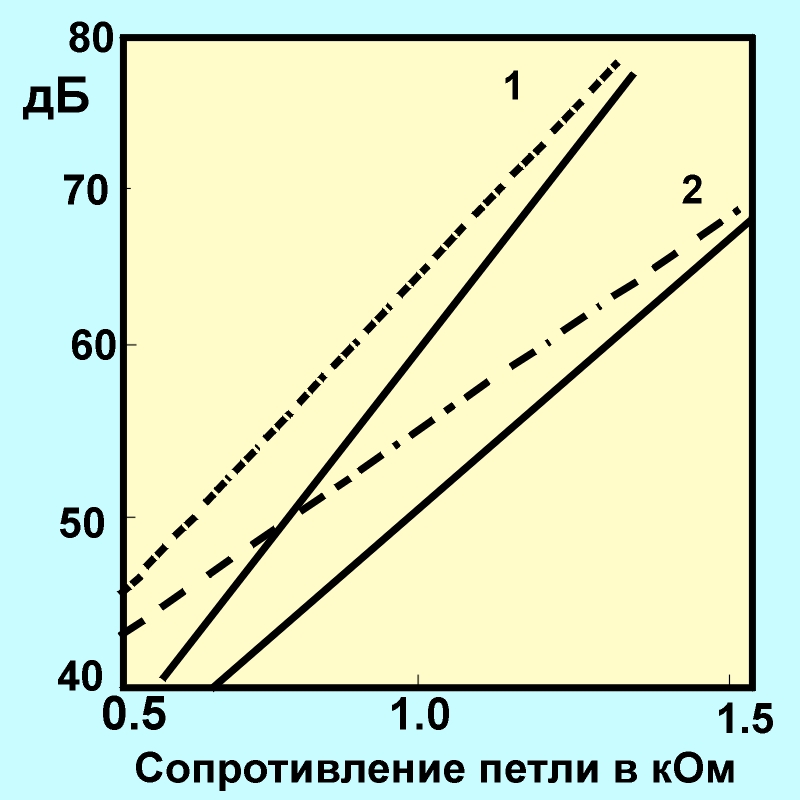 На рис. 2.1.8 показана зависимость отношения сигнал-шум от сопротивления петли для разных схем передающего канала. Пунктиром проведены зависимости для случая четырехуровневого кодирования. Кривые 1 соответствует случаю амплитудной модуляции с линейным выравниванием, а кривые 2 - варианту эквилизации с обратной связью. |