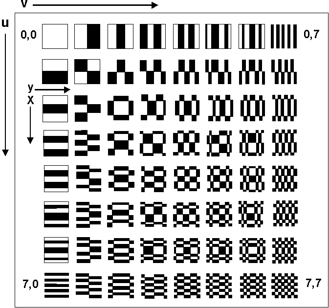 где v - горизонтальная координата графического блока, u - вертикальная, x - вертикальная координата внутри блока, а y - горизонтальная координата внутри блока, C(u), C(v) = 1/