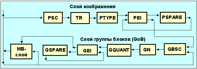 Рис. 2.5.4. Схема передачи кадра изображения Поле Ptype содержит 6 бит, которые характеризуют формат изображения (используется ли формат CIF или QCIF). Однобитное поле PEI указывает на то, следует ли далее 8-битное поле PSpare (предназначено на будущее). Если PEI=0, начинается цикл передачи GoB. Группа блоков составляет одну двенадцатую картинки CIF или одну треть QCIF. GoB описывает Y (яркость), 176 пикселей для каждой из 48 строк и соответствующие 88*24 элементов для CB и CR. GBSC - (Group of Blocks Start Code) представляет собой 16-разрядное слово, за которым следует 4 бита номера GoB (GN - GoB number). GN указывает, какой части изображения соответствует данный GoB. Поле gquant имеет 5 бит и указывает на номер преобразователя (одного из 31 дискретизаторов), который используется данным GoB. Смысл GEI идентичен PEI. GEI и GSpare позволяют сформировать структуру данных, идентичную той, что используется на уровне кадра. Формат пересылки mb сложнее (см. [17]). Каждый GoB делится на 33 макроблока (MB), каждый из которых соответствует 16 строкам по 16 пикселей Y (четыре блока 8*8) и CB и CR. Каждый макроблок начинается с его адреса MBA (MacroBlock Address), имеющего переменную длину и определяющего положение макроблока в GoB.