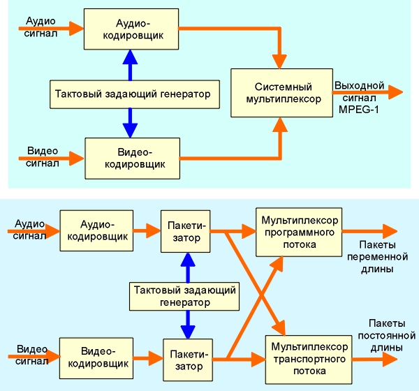 Мультиплексирование аудио- и видеоданных в MPEG-2 показано на рис. 2.5.8. На выходе пакетизатора мы имеем элементарные потоки пакетов (PES- Packetized Elementary Stream), содержащих около 30 полей, включая длину, идентификаторы потоков, временные метки, контрольные суммы и т.д. В MPEG-2 формируется два комплексных потока, программный поток (PS) длинных пакетов переменной длины сходный с MPEG-1, содержащий видео и аудио данные и имеющий общую временную шкалу, и транспортный поток (TS) пакетов постоянной длины (188 байт) без общей временной шкалы. В последнем случае минимизируется влияние потерь пакетов в процессе транспортировки. Предусмотрено выделение в потоке составляющих разной степени важности (например, DCT-коэффициентов и обычных графических данных).