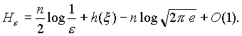 Пусть x = (x 1,.,x n) и h = (h 1,.,h n) - векторные случайные величины в n-мерном евклидовом пространстве X и r(x,y) - некоторая неотрицательная функция, определяющая условие близости величин x и h, которое выражается следующим соотношением: Mr(x ,h ) ё e . Величину H=H e , определенную как H e = inf I(x, h), обычно называют e-энтропией случайной величины x (нижняя грань берется по всем случайным величинам h, удовлетворяющим указанному условию e-близости случайной величине x). Пусть r(x,y) = r(|x-y|) и существует производная r'(0), 0< r'(0)<╔. Тогда при e ╝ 0 имеет место асимптотическая формула, в которой логарифмы берутся по основанию e: