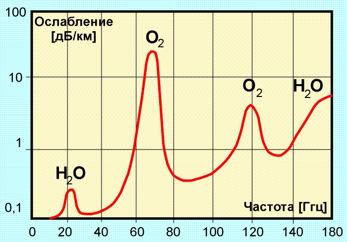 Рис. 3.3.1а. Зависимость поглощающей способности земной атмосферы от длины волны Из рисунка видно, что заметную роль в поглощении радиоволн играет вода. По этой причине сильный дождь, град или снег могут привести к прерыванию связи. Поглощение в атмосфере ограничивает использование частот более 30 ГГц. Атмосферные шумы, связанные в основном с грозовыми разрядами, доминируют при низких частотах вплоть до 2 МГц. Галактический шум, приходящий из-за пределов солнечной системы дает существенный вклад вплоть до 200 ГГц. Зависимость поглощения радиоволн в тумане и дожде от частоты показана на рис. 3.3.2.