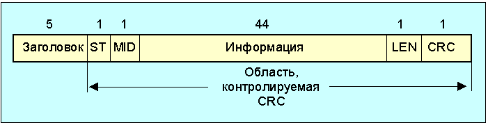 Рис. 4.1.9.1. Формат ячейки DQDB (цифры в верхней части рисунка характеризуют длины полей) Поле ST (segment type) характеризует тип сегмента. Поле MID (message identifier) представляет собой идентификатор сообщения. LEN -характеризует длину поля данных, а CRC - это контрольная сумма ячейки. Когда станция намерена передать ячейку, она должна знать, справа или слева от нее находится место назначения. Если место назначения справа, отправитель использует шину А, в противном случае передача производится по шине В. Для ввода данных на шину применяется схема проволочного ИЛИ. По этой причине обесточенная станция не вызовет отказа всего сегмента сети. Станция образуют очередь для передачи в порядке поступления заявок (fifo). Структура заголовка ячейки показана на рис. 4.1.9.2 она весьма схожа с той, что имеет ячейка atm.