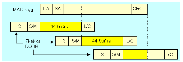 Рис. 4.1.9.4. Сегментация МАС-кадра Сети DQDB могут иметь размер до 160 км при скорости передачи данных 44,736 Мбит/с (Т3). |