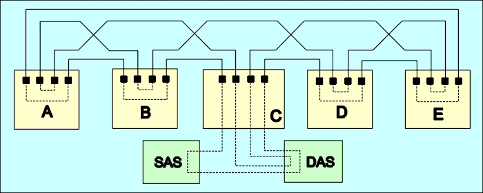 Одной из наиболее популярных сетей, использующих оптическое волокно, (не считая fast ethernet) является FDDI. FDDI (fiber distributed data interface, ISO 9314-1, rfc-1512, -1390, -1329, -1285 - смотри также http://iquest.com/~nmaller/fddi.htm) стандарт американского института стандартов (ansi), принятый без изменения ISO. Протокол рассчитан на физическую скорость передачи информации 100 Мбит/с и предназначен для сетей с суммарной длиной до 100км (40 км для мультимодовых волокон) при расстоянии между узлами 2 км или более. Частота ошибок в сети не превышает 10-9. В FDDI используется схема двойного кольцевого счетчика (рис. 4.1.6.1; буквами a,b,c,d и e обозначены станции-концентраторы). Кольцевая схема единственно возможное решение для оптического волокна (не считая схемы точка-точка). Для доступа к сети используется специальный маркер (развитие протокола IEEE 802.5 - Token Ring). Сети FDDI не имеют себе равных при построении опорных магистралей (backbone) локальных сетей, позволяя реализовать принципиально новые возможности - удаленную обработку изображений и интерактивную графику. Обычно устройства (DAS - dual attached station) подключаются к обоим кольцам одновременно. Пакеты по этим кольцам движутся в противоположных направлениях. В норме только одно кольцо активно (первичное), но при возникновении сбоя (отказ в одном из узлов) активизируется и второе кольцо, что заметно повышает надежность системы, позволяя обойти неисправный участок (схема соединений внутри станций-концентраторов на рис. 4.1.6.1 является сильно упрощенной). Предусмотрена возможность подключения станций и только к одному кольцу (SAS - single attached station), что заметно дешевле. К одному кольцу можно подключить до 500 das и 1000 sas. Сервер и клиент имеют разные типы интерфейсов.
