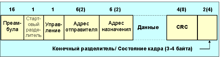 Рис. 4.1.6.6. Формат кадра-маркера 802.2 класс I LLC требует поддержки команд ненумерованная информация (UI), команд и откликов exchange identification (XID), а также test. Станции не обязаны уметь передавать команды XID и test, но должны быть способны посылать отклики. Командные кадры идентифицируются по нулевому младшему биту SSAP-адреса. Кадры-отклики имеют младший бит SSAP-адреса равный 1. UI-команды содержат в управляющем поле LLC код 3. Команды/отклики XID имеют код поля LLC, равный 175 (значение десятичное) при значении бита poll/final=0 или 191 при poll/final=1. Код управления LLC для команд/откликов test равен 227, если poll/final=0, и 243 при poll/final=1. Отклики и команды UI при poll=1 игнорируются. Команды UI, имеющие отличные от snap sap в DSAP- или SSAP-полях, не считаются пакетами IP или ARP. При получении команд XID или test должен быть послан соответствующий отклик. Отклик посылается, когда DSAP равен SNAP SAP (170), null SAP (0), или при global SAP (255). При других DSAP отклики не посылаются. При посылке отклика на команды XID или test, значение бита final отклика должно быть равно значению бита poll команды. Кадр отклика XID должен включать в себя информационное поле 802.2 XID 129.1.0, указывающее на класс услуг 1 (не требующих установления связи). Кадры отклика test должны соответствовать информационному полю кадра команды test. Для начала передачи станция должна получить в свое распоряжение маркер. Если станция находится в пассивном состоянии, она передает маркер следующей станции. Но из-за большой протяженности колец FDDI время задержки здесь заметно больше, чем в случае Token Ring. В кольце FDDI может находиться несколько кадров одновременно. Станция сама удаляет кадры из кольца, посланные ей самой. Все станции должны иметь таймер вращения маркера (TRT - token rotation time), который измеряет время с момента, когда станция последний раз принимала этот пакет. Имеется переменная TTRT (target token rotation time). Значение TRT сравнивается с TTRT и только приоритетные кадры могут быть переданы при TRT> TTRT. Обычная передача данных контролируется таймером THT (token hold timer). Когда станция получает маркер, она заносит TRT в таймер THT, который начинает обратный отсчет. Станция может посылать кадры до тех пор, пока THT остается больше TTRT. В действительности THT определяет максимальное число октетов (символов), которое может быть послано станцией в рамках одного кадра (THT задает предельное время, в течение которого станция может передавать данные). IEEE специфицирует числа как последовательности бит, где младший бит передается первым. В протоколах Интернет порядок бит другой, что может вызывать ошибки. Ниже приведена краткая таблица (4.1.6.1) соответствия для некоторых из чисел. Таблица 4.1.6.1