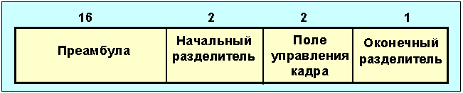 Рис. 4.1.6.5. Формат пакета протокола FDDI Вычитая 8 байт LLC/SNAP заголовка, получаем значения максимального размера пакета (MTU) 4470 (4478) октетов. Для совместимости размер пакетов для IP-дейтограмм и ARP-пакетов согласуется с требованиями конкретной сети. FDDI реализует маркерный доступ, формат пакета-маркера имеет вид, показанный на рис. 4.1.6.6. В зависимости от размера кольца в нем могут циркулировать несколько маркеров.