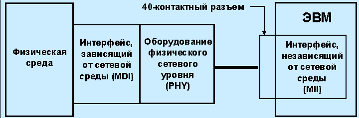100-мегагерцную сеть ethernet дешевле создать на базе скрученных пар. Существует несколько версий 100-мегагерцного ethernet ( 100base-T4, 100base-TX, 100base-FX, стандарт 100VG-anylan - IEEE 802.12). TX и RX передатчики и приемники входных/выходных оптоволоконных трансиверов, соответственно. FOMAU - (fiber optic media attachment unit) оптоволоконный трансивер (см. рис. 4.1.1.1.9). Сегменты T4 (100base-T4) используют четыре скрученные пары телефонного качества (экранированные и неэкранированные скрученные пары проводов категории 3, 4 или 5) длиной до 100м. Провода должны быть скручены по всей длине, скрутка может быть прервана не далее как в 12мм от разъема (это требование справедливо и для сегментов типа TX). Сегменты TX (100base-TX, стандарт ANSI TP-PMD) состоят из двух скрученных пар проводов информационного качества (волновое сопротивление 100-150 Ом, экранированные и неэкранированные скрученные пары проводов категории 5, длина до 100м). FX-сегменты (100base-FX) представляют собой оптоволоконные кабели, отвечающие требованиям стандарта ANSI. Мультимодовое волокно 62,5/125 m (см. выше) работает в инфракрасном диапазоне 1350нм. Максимальная длина сегмента составляет 412 метров, ограничение определяется соображениями допустимых задержек. Предельное ослабление сигнала в волокне не должно превышать 11 дБ, стандартный кабель имеет 1-5 дБ/км. Оптические разъемы должны отвечать тем же требованиям, что и разъемы, используемые в FDDI-сетях (MIC- Media Interface Connector). Для того, чтобы выявить, к какой модификации относится тот или иной сегмент, разработан специальный протокол распознавания, позволяющий строить сети, которые содержат оборудование и кабельные сегменты, отвечающие разным требованиям. Универсальная схема подключения ЭВМ или любого другого оборудования (например, сетевого принтера) к 100-мегагерцному ethernet показана на рис. 4.1.1.2.1. Физическая среда служит для передачи сигналов Ethernet от одной ЭВМ к другой. Выше были перечислены три вида физических сред, используемых 100-мегагерцным Ethernet (T4, TX и FX). Здесь используется 8-контактный разъем (RJ-45) для скрученных пар или специальный оптоволоконный соединитель. Блок PHY выполняет ту же функцию, что и трансивер в 10-мегагерцном Ethernet. Он может представлять собой набор интегральных схем в сетевом порту или иметь вид небольшой коробочки на MII-кабеле. Интерфейс MII является опционным, он может поддерживать работу с 10- и 100-мегагерцным ethernet. Задачей MII является преобразование сигналов, поступающих от PHY, в форму, приемлемую для стандартного набора ИС Ethernet. Соединительный кабель не должен быть длиннее 0,5м. PHY и MII могут быть объединены на одной интерфейсной плате, вставляемой в ЭВМ.