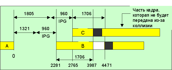 Когда А передает кадр, узлы В и С отслеживают наличие несущей. Это продолжается до тех пор, пока А не завершит эту процедуру. Как только узлы В и С фиксируют окончание передачи кадра узлом А, они запускают свои таймеры IPG. Запускает свой таймер ipg и узел А, причем его таймер стартует первым. На рис. 4.1.1.2.5 показана временная диаграмма развития событий в сетевом сегменте. Таймер В стартует следующим через 1321 нсек после А. Таймер узла С стартует спустя 1805 нсек после А.
