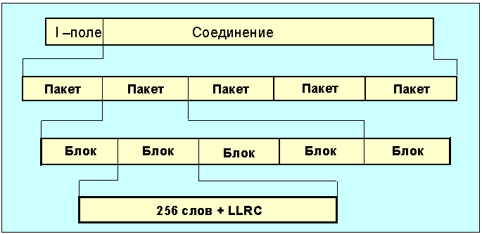 Рис. 4.1.7.1. Пример топологии сети hippi (П - переключатели, С - станции) HIPPI предполагает передачу данных по медному кабелю (или оптическому волокну) только в одном направлении по схеме связи точка-точка, но два канала HIPPI могут обеспечить и двунаправленный обмен данными. Передающий кабель может содержать 50/100 скрученных пар или соответствующее число оптических волокон. Длина пакета данных может варьироваться. Протокол HIPPI рассчитан на работу в реальном масштабе времени при суммарных длинах кабелей до десятков километров. Стандартный блок данных содержит 256 слов (1024 или 2048 байт). Для контроля корректности передачи предусмотрен контроль по четности для каждого байта на шине, кроме того, для каждого блока данных вычисляется "продольная" контрольная сумма (LLRC - length/longitudinal redundancy checkword). На рис. 4.1.7.2 показана схема передачи данных в рамках протокола HIPPI. На каждое соединение может быть передано любое число пакетов, пакет в свою очередь может содержать любое число блоков. Время между пакетами не регламентировано и может меняться, оно зависит от потока данных и протокола верхнего уровня.