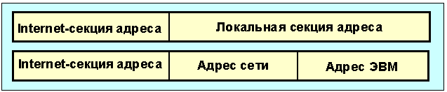 Рис. 4.1.1.3.2.а. Специальные ip-адреса IP-адрес имеет Интернет- и местную секции, первая характеризует место (организацию, сеть или даже группу сетей), вторая - конкретную ЭВМ. Местная секция адреса может быть разделена на части, характеризующие локальную сеть и конкретную ЭВМ (рис. 4.1.1.3.3).