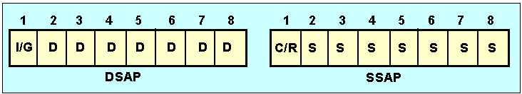 Рис. 4.1.1.3.5. Вложение пакетов Интернет в Ethernet- и IEEE 802 пакеты LLC - управление логической связью (logical link control); DSAP = 0xaa (destination service access point) - поле адреса доступа к службе получателя; SSAP = 0xaa (source service access point) - поле адреса доступа к службе отправителя; SNAP - протокол доступа к субсетям (subnetwork access protocol). PAD - поле заполнитель. В общем случае форматы полей DSAP и SSAP имеют вид, показанный на рис. 4.1.1.3.6 I/G = 0 - индивидуальный адрес, I/G =1 - групповой адрес; D - бит адреса службы места назначения, S - бит адреса службы отправителя; C/R =0 - команда, C/R =1 - подтверждение.