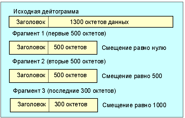 Рассмотрим по фрагментную передачу дейтограммы с длиной в 1300 октетов в предположении, что более 576 октетов за один раз передать нельзя.