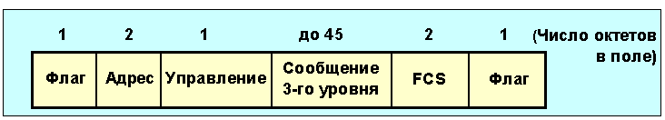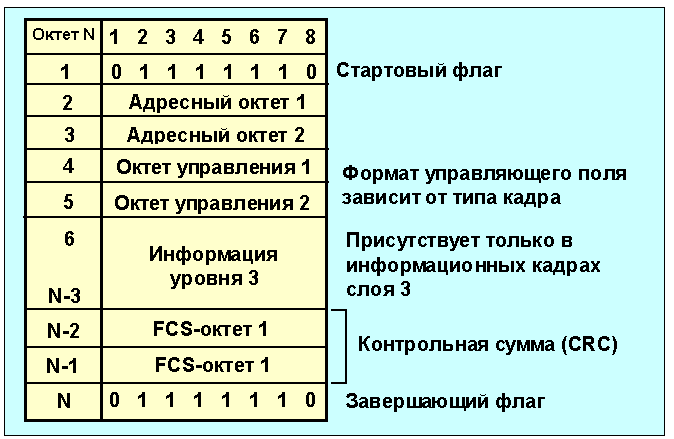 Рис. 4.3.3.7 Структура кадра для слоя 2 Стартовый и завершающие флаги передаются так, что к любым 5 единицам подряд добавляется нуль (чтобы избежать имитации сигнатуры в других, в том числе информационных полях). Принимающая сторона эти нули убирает. FSC- вычисляется по методике CRC, описанной в разделе 3.3.1. Каждый кадр начинается и завершается одной и той же последовательностью (сигнатура начала/конца кадра). Размер управляющего поля зависит от типа кадра (1 или 2 октета). Информационные элементы присутствуют только в кадрах, содержащих данные 3-го уровня. Формат двухбайтного поля адреса для уровня 2 показан на рис. 4.3.3.7. Адрес имеет лишь локальное значение и известен только участникам процедуры обмена. Формат байтов адреса показан на рис. 4.3.3.8.