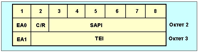 Рис. 4.3.3.12 Формат поля управления ненумерованных кадров m - бит модификатора функции (см. таблицу 4.3.1.2). Мультиплексирование на уровне 2 осуществляется за счет использования отдельного адреса для каждого LAP (link access procedure) в системе. Адрес содержит два байта и определяет приемник командного кадра и адрес передатчика кадра-отклика. SAPI используется для идентификации типа услуг. Если наряду с цифровым телефоном используется обмен данными, то эти два терминала будут подключены к разным типам сервиса и, вообще говоря, к разным сетям. Для каждого вида услуг фиксируется определенный код SAPI. TEI (terminal endpoint identifier) обычно имеет определенное значение для каждого из терминалов пользователя. Комбинация SAPI и TEI однозначно описывает LAP (link access procedure) и определяет адрес второго уровня. Так как в системе не может быть двух идентичных TEI, коды TEI распределяются следующим образом: