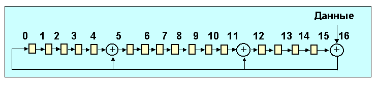 Рис. 4.3.3.14 Схема вычисления контрольной суммы (FCS/CRC) Другой возможной ошибкой является получение I-кадра с неверным номером N(S). Это возможно, когда LAP работает при ширине окна более 1. Если потерян кадр с номером N(s)=k, принимающая сторона не должна посылать подтверждение приема кадра k+1. Отклик при этом имеет тип REJ (см. таблица 4.3.3.1) с N(R)=k+1. Это укажет передающей стороне, что все кадры до k получены, но необходимо возобновить передачу, начиная с кадра k. При выявлении ошибки в N(R) связь прерывается, реинициализируются переменные состояния передающей и принимающей сторон, после чего канал восстанавливается, и обмен возобновляется с самого начала. Таблица 4.3.3.1. (См. также раздел о протоколе X.25)