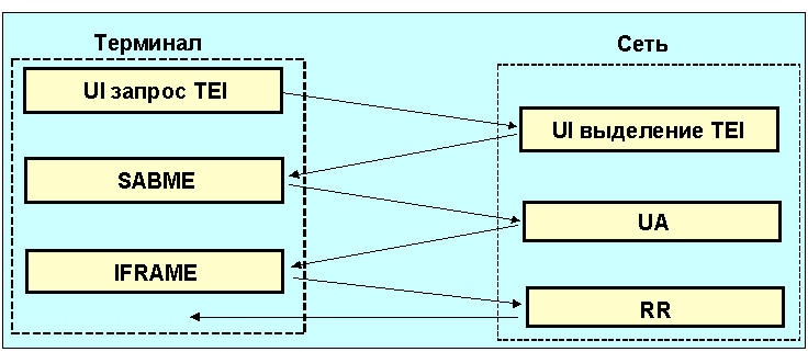 Рис. 4.3.3.15 Восстановление системы после потери кадра RR Сигнал RNR(получатель не готов) используется для запрета пересылки пакетов партнеру на уровне 2 и может использоваться при реализации приоритетных услуг. Другим пакетом, который специфицирован на уровне 2, является кадр frame reject (FRMR). Этот кадр может быть получен объектом второго уровня, но не может быть послан. При получении этого кадра система сбрасывается в исходное состояние. После завершения процедуры обмена разрыв канала производится путем посылки кадров DISC (disconnect) и отклика UA (unnumbered acknowledgment), с этого момента обмен кадрами I-типа не возможен. Кадр DM(disconnect mode) может выполнять те же функции, что и UA. Он используется в качестве отклика на SABME, если слой 2 не может установить связь, или отклика на disc, если связь уже разорвана. Для управления и контроля за выделяемыми идентификаторами TEI предназначен специальный драйвер, который имеет возможность выделять и удалять используемые TEI. Все сообщения, связанные с TEI, передаются с помощью пакетов SAPI (service access point identifier). Так как работа с TEI должна выполняться вне зависимости от состояния уровня 2, все TEI-сообщения являются ненумерованными (UI) и не требуют отклика. Надежность достигается путем многократной пересылки пакетов. Пока терминалу не присвоен TEI (terminal endpoint identifier), используется широковещательный метод обмена. Все терминалы пользователя должны воспринимать любые управляющие кадры. Кадры управления в процессе присвоения TEI терминалу рассылаются широковещательно. Схема присвоения TEI и установления связи показана ниже на рис. 4.3.3.16: