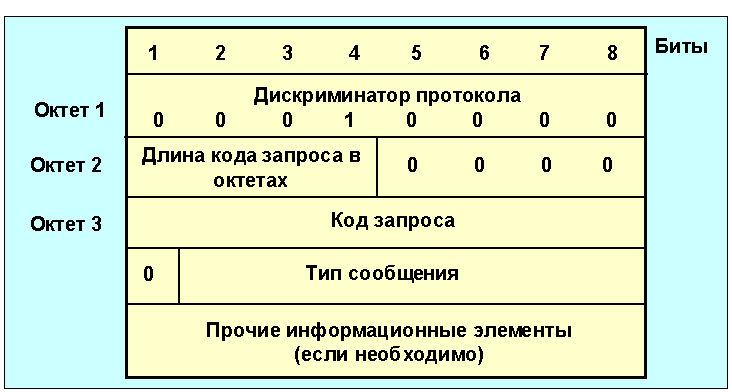 Рис. 4.3.3.17 Формат сигнального пакета уровня 3 Эти пакеты следуют от терминала к коммутатору и наоборот. Первый октет (поле протокольный дискриминатор) дает D-каналу в будущем возможность поддержки нескольких протоколов. Приведенный код соответствует стандартному управляющему запросу пользователя. Третий октет (поле код запроса - call reference value) используется для идентификации запроса вне зависимости от типа коммуникационного канала, где этот запрос может быть реализован. Четвертый байт характеризует назначение пакета (например, Setup - запрос установления канала). Возможные типы сообщений перечислены в таблице 4.3.3.2. Длина сообщения зависит от его типа. Стандарт не регламентирует содержания полей, следующих за полем тип сообщения, и они могут использоваться по усмотрению пользователя для расширения функциональных возможностей системы. Таблица 4.3.3.2 Коды типов сообщений