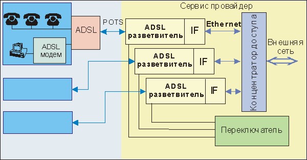 Рис. 4.3.7.5. Схема подключения телевизора и телефона через модем ADSL |
