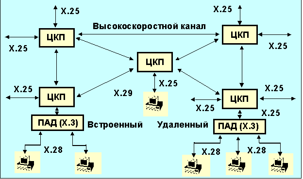 В 1976 году был принят стандарт X.25, который стал основой всемирной системы PSPDN (Packet-Switched Public Data Networks), базирующейся на 7-уровневой модели ISO OSI. Стандарт X.25 был усовершенствован в 1984. X.25 - протокол (ISO 8208:1989; RFC-887, -1381, -1382, -1461, -1598, -1613), который определяет синхронный интерфейс между терминальным оборудованием (DTE - Data Terminal Equipment) и оборудованием передачи данных (DCE - Data Communication Equipment) для терминалов, работающих в пакетном режиме. По существу это протокол связи оборудования с сетью. Главный недостаток протокола X.25 - большие задержки отклика (типовое значение 0.6 сек). Терминалом может служить ЭВМ или любая другая система, удовлетворяющая требованиям X.25. Соединение DTE - DTE осуществляется через DCE. В протоколе X.25 DCE и DTE используют статистическое мультиплексирование с делением по времени. Одновременно могут реализовываться несколько обменных процессов. Схема взаимодействия DTE и DCE выглядит как: DTE - <логический канал> - DCE <виртуальное соединение> - DCE - <логический канал> - DTE Асинхронный старт-стопный терминал подключается к сети коммутации пакетов через пакетный адаптер данных ПАД (PAD - packet assemble/disassemble) и отвечает рекомендациям X.3, X.28 и X.29. Один ПАД обеспечивает интерфейс для 8, 16 или 24 асинхронных терминалов. Пакет данных состоит обычно из 128 байтов, которые передаются по адресу, содержащемуся в пакете. Но длина пакета может лежать в пределах 64-4096 байтов. Размер пакета также как и величина окна (число пакетов, принимаемых без подтверждения) определяются на фазе установления канала. Прежде чем пакет будет передан, необходимо установить связь между исходными ЭВМ/ПАД и адресуемыми ЭВМ/ПАД. Существуют два вида соединений: коммутируемый виртуальный канал (SVC) и постоянный виртуальный канал (PVC). Предусмотрены две процедуры доступа к каналу: