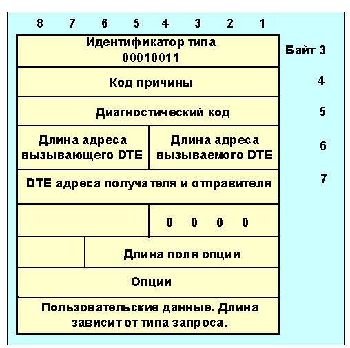 Рис. 4.3.2.4. Формат кадра запроса на соединение и соединение установлено Поле опции содержит целое число октетов, но не более 109, следующее же поле может содержать до 128 байт. Опция типа fast select позволяет поместить до 64 байтов в информационном поле пользователя, во многих случаях этого оказывается достаточно и исключается необходимость переходить в режим пересылки данных. Если вызываемое DTE не присылает сообщения вызов принят или запрос завершения (установление связи отвергнуто) за отведенное для этого время, процедура завершается и процессу, инициализировавшему запрос, присылается соответствующий код ошибки. При успешной обработке запроса (прислано сообщение соединение установлено) система переходит в режим обмена данными. DTE может в любой момент инициировать процедуру разрыва связи, послав сообщение запрос завершения. DCE сообщает о завершении соединения путем присылки пакета индикация завершения, на который DTE должно прислать отклик подтверждение завершения. Формат пакетов запроса и подтверждения завершения отображен на рис. 4.3.2.4. и 4.3.2.5. Байты 1 и 2 на рисунке 4.3.2.5 не показаны, так как они идентичны тому, что представлено на рис. 4.3.2.4.